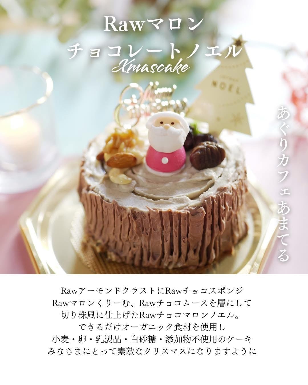 オーガニックアーモンドとオーガニックデーツから作るクラストにRawチョコレートスポンジ生地に有機甘栗で作るRawマロンクリーム、その上にオーガニックRawカカオで作るRawチョコレートムースを土台のケーキで作らせていただいております。