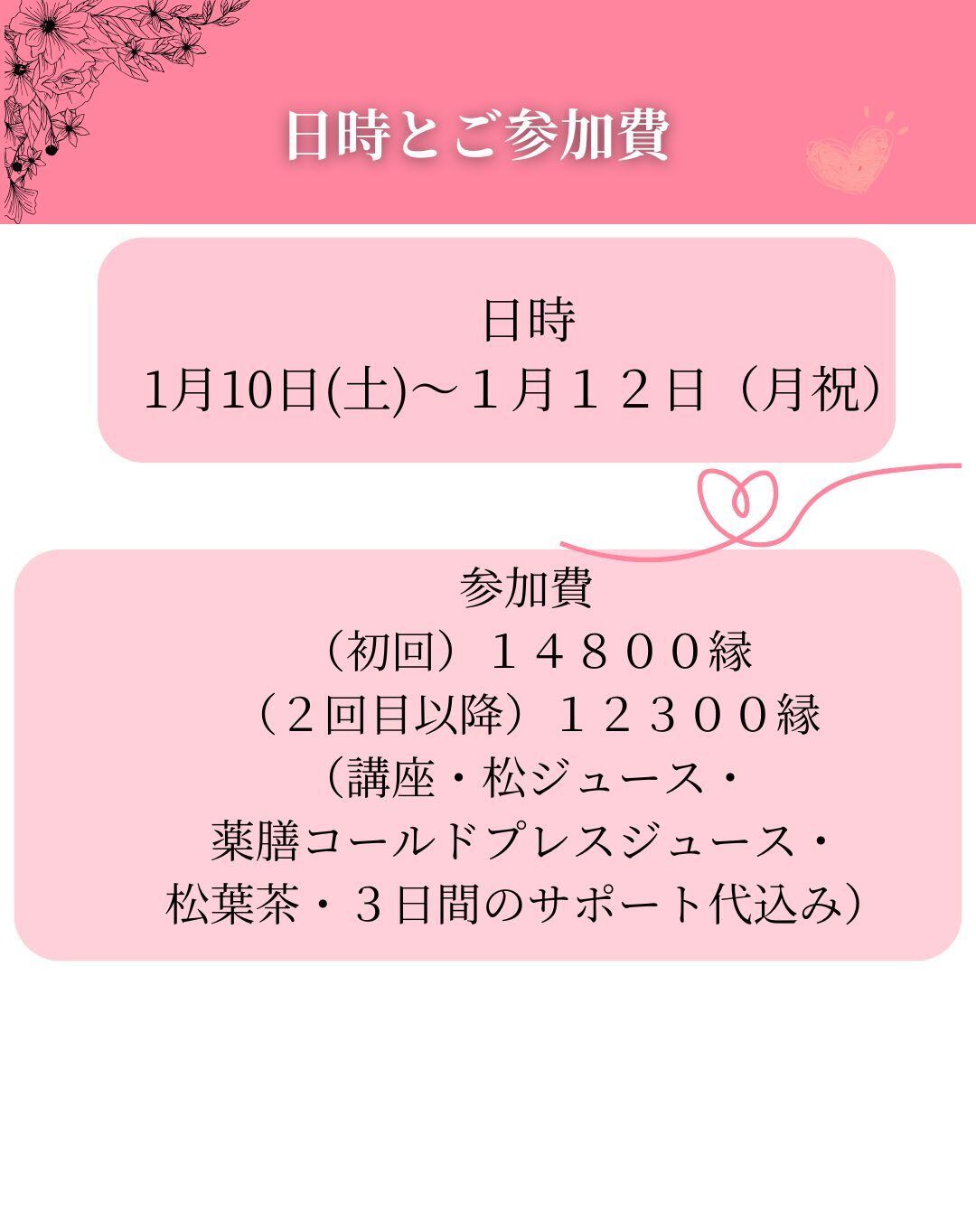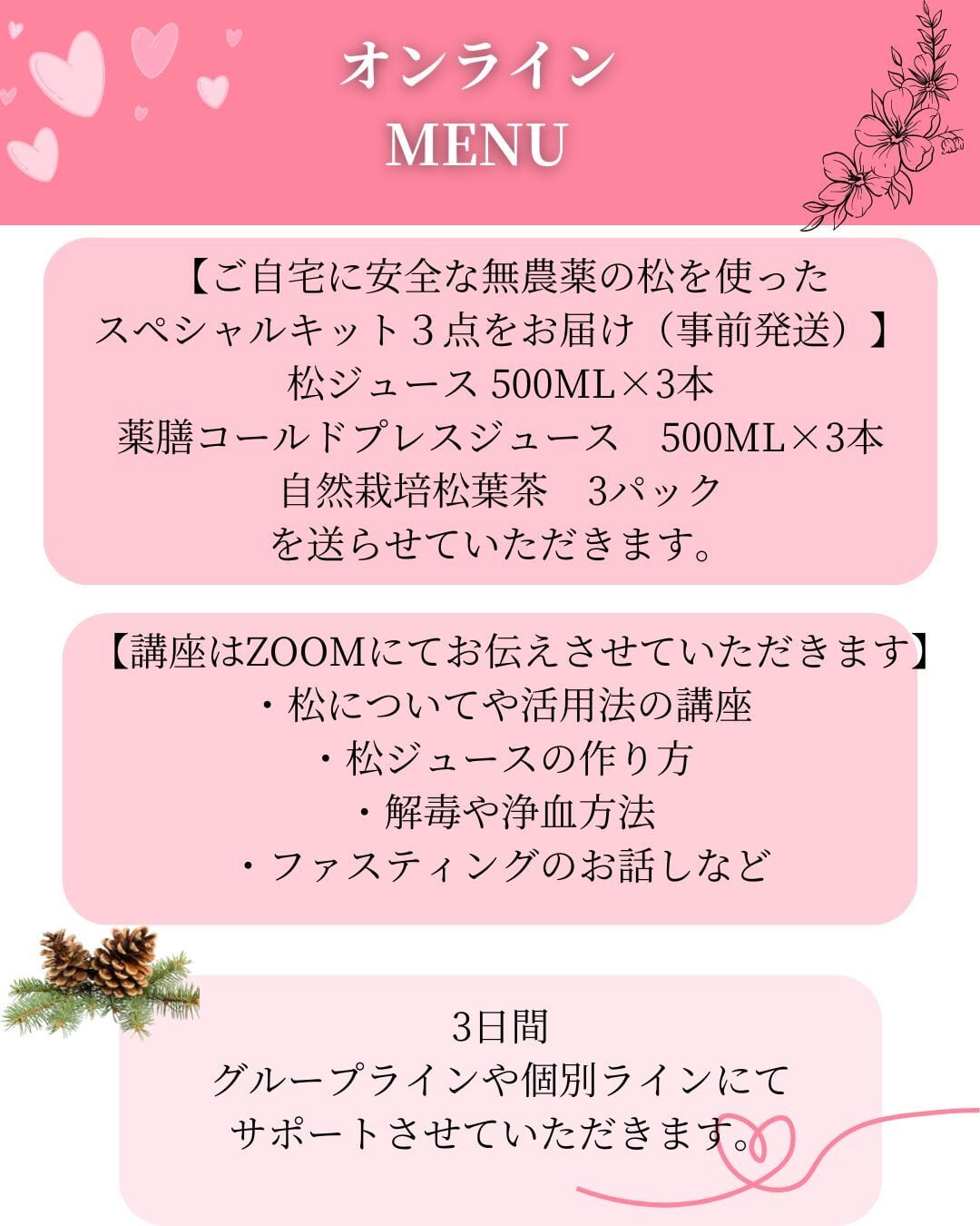 (講座・松ジュース・薬膳コールドプレスジュース・松葉茶・3日間のサポート代込み)