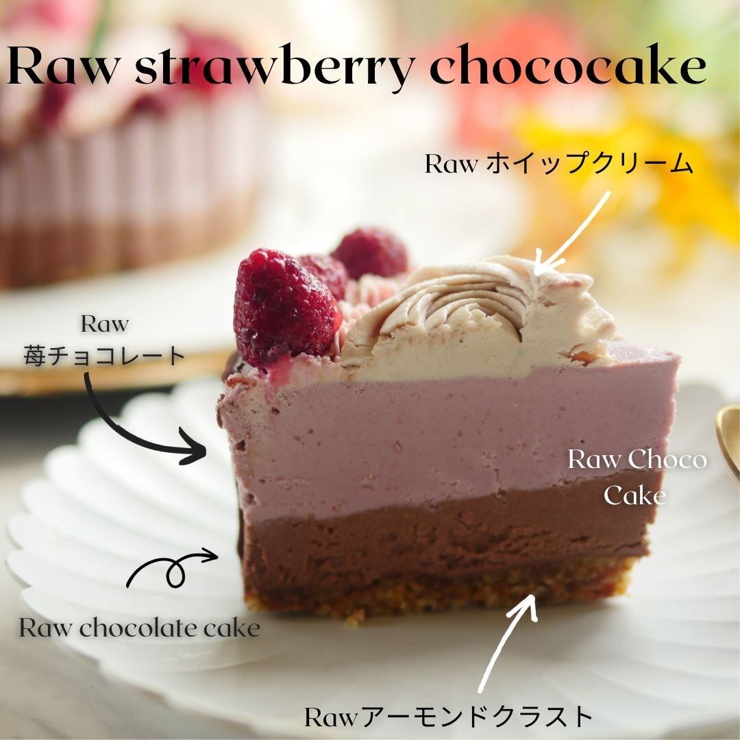 上の層は水は一切使わずに苺の水分のみで作る苺Rawホワイトチョコレートケーキ、